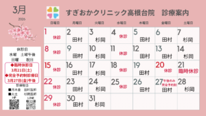 3月以降の臨時休診につきましては、下記カレンダーをご覧ください。